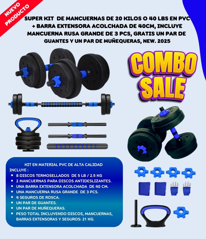 Super Kit De Mancuernas 20 Kilos + Barra Extensora De 40cm + Mancuerna Rusa Grande De 3 Pcs + Obsequios, En Pvc De Alta Calidad. 40 Libras, New. 2026